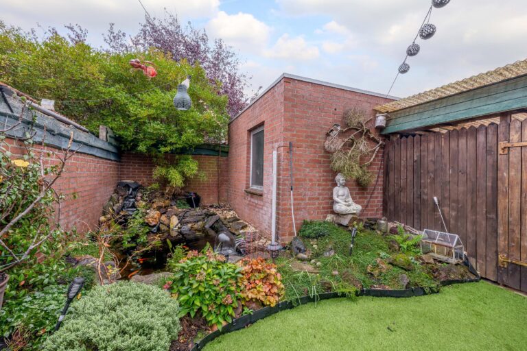 De achtertuin is geheel omheind en voorzien van een grote vijver. De overkapping is voorzien van elektra en is volledig af te sluiten door middel van zeilwanden. In het stenen schuurtje zijn elektra en de tweede witgoedaansluiting aanwezig.