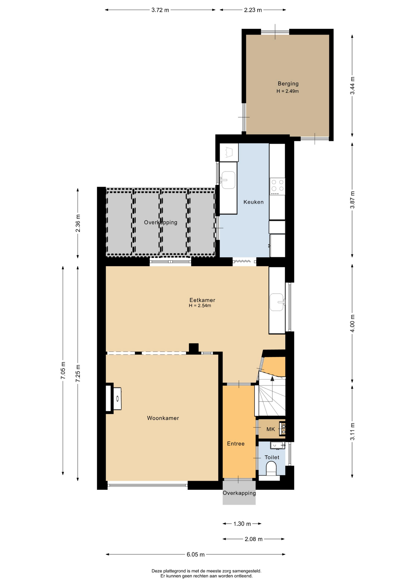 In de hal ligt een laminaatvloer. Hier zijn de meterkast en het toilet met fonteintje aanwezig. Vanuit de hal is de woonkamer bereikbaar. De ruime woonkamer is voorzien van een laminaatvloer, airco en pelletkachel. Een deur biedt toegang tot de kelder.