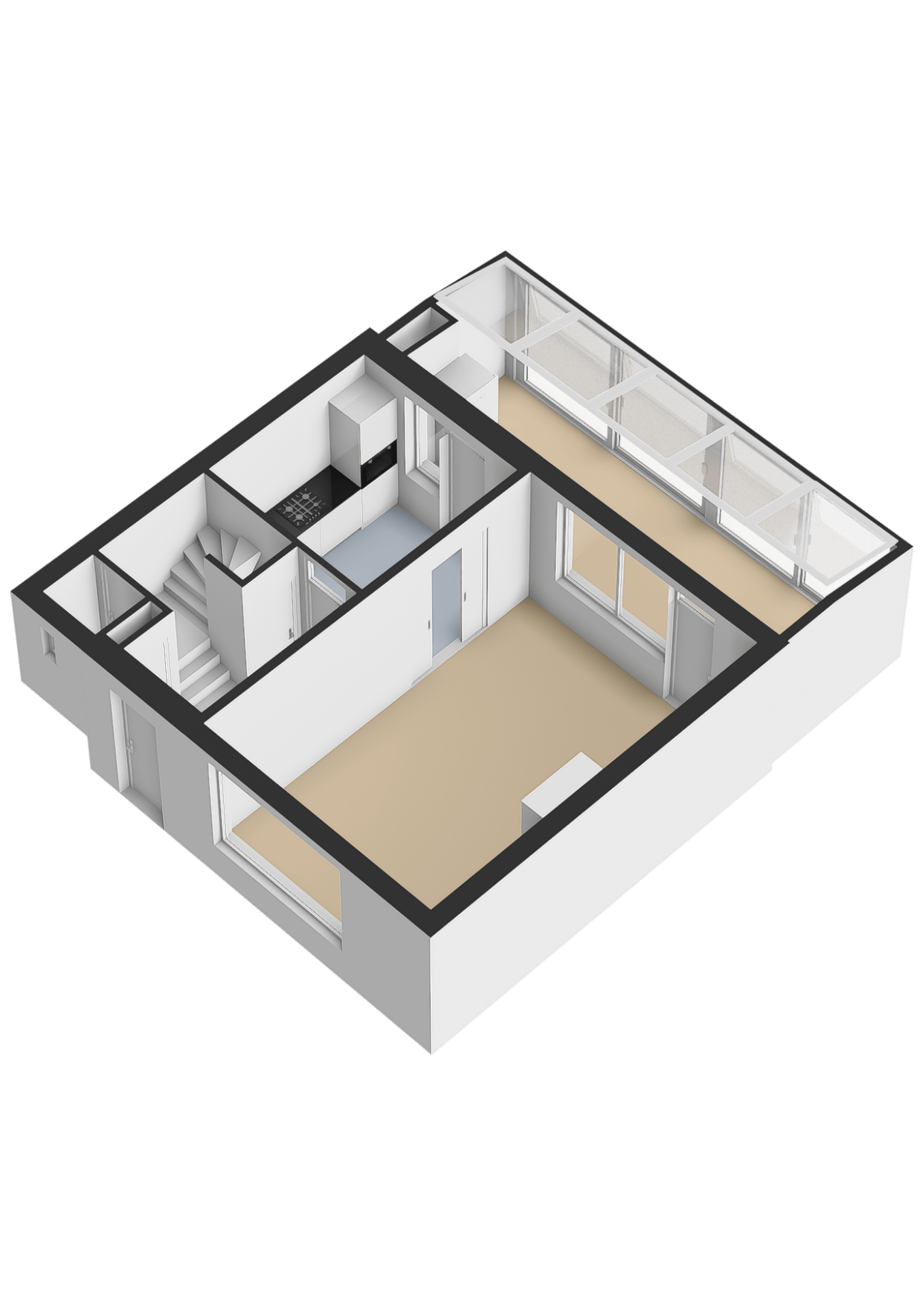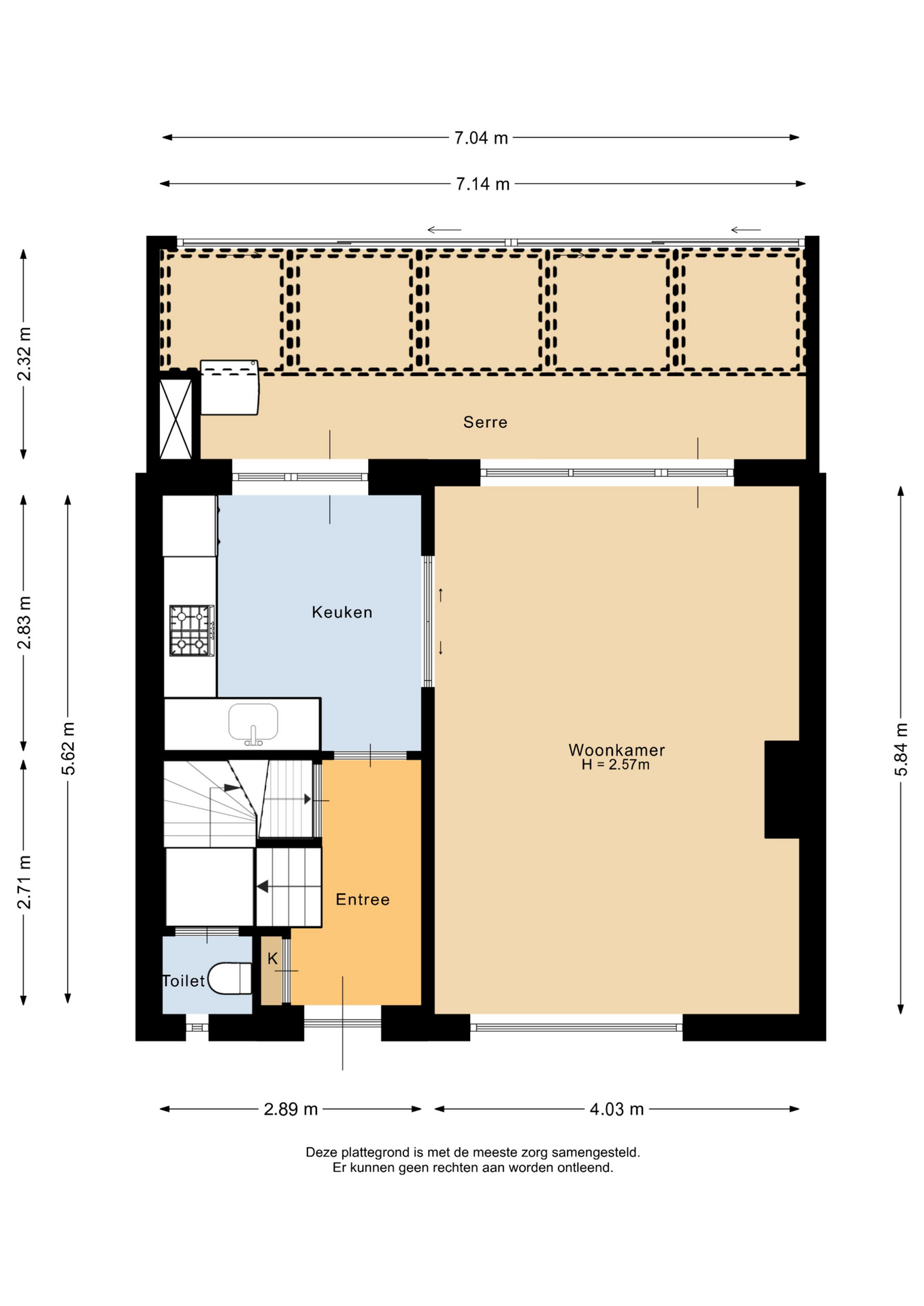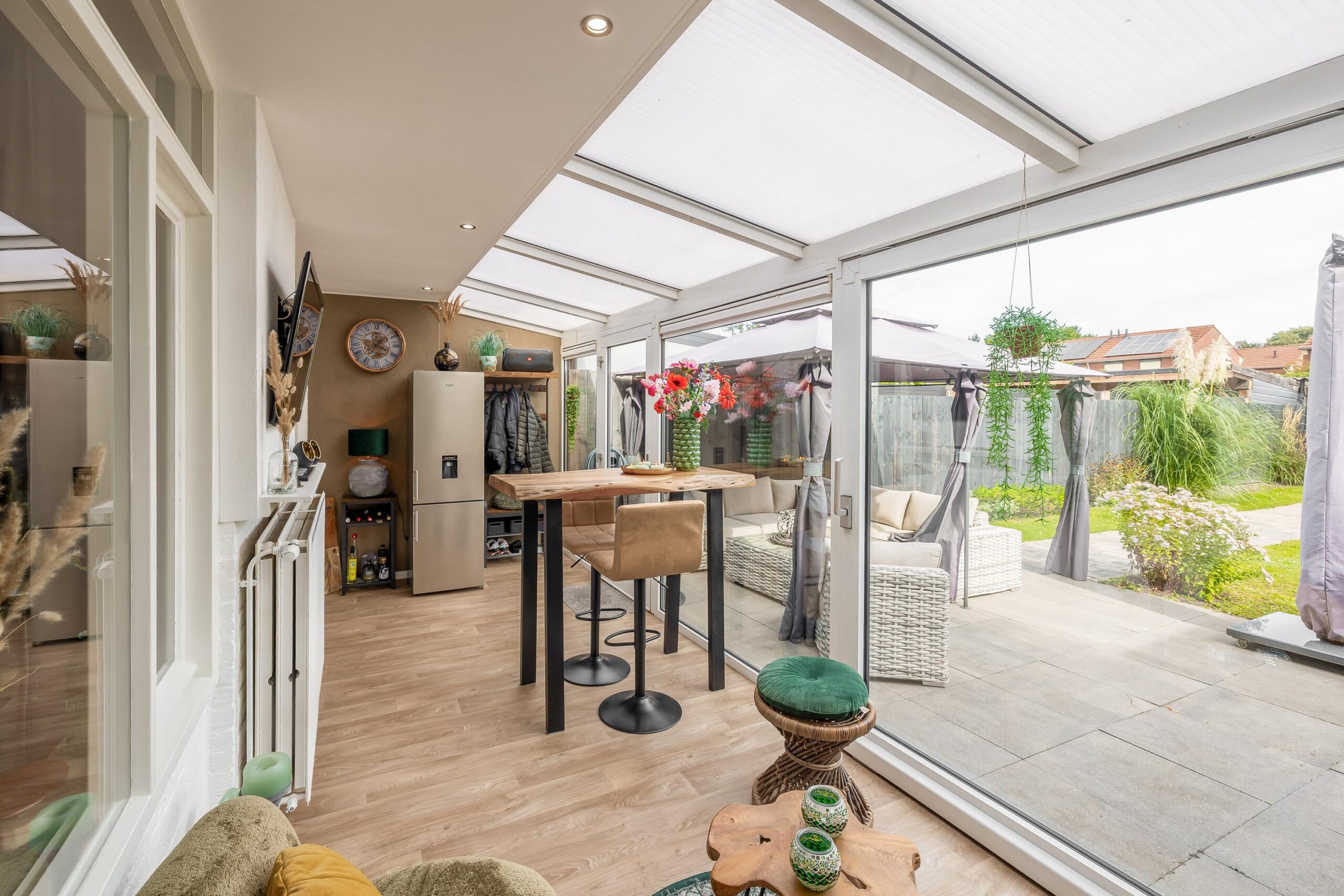 De hal is voorzien van de meterkast en het toilet. In de hal, keuken en serre ligt een vinyl vloer. De woonkamer (ca. 24m²) is voorzien van een houten vloer. Er is airco aanwezig en de loopdeur biedt toegang tot de serre.