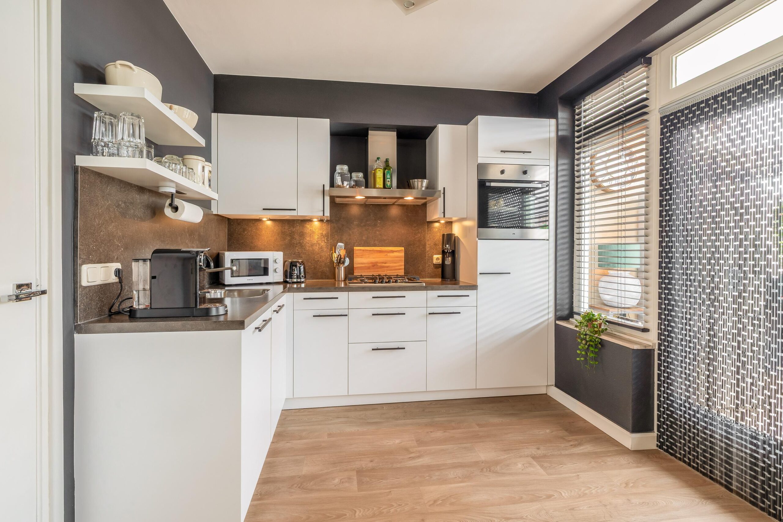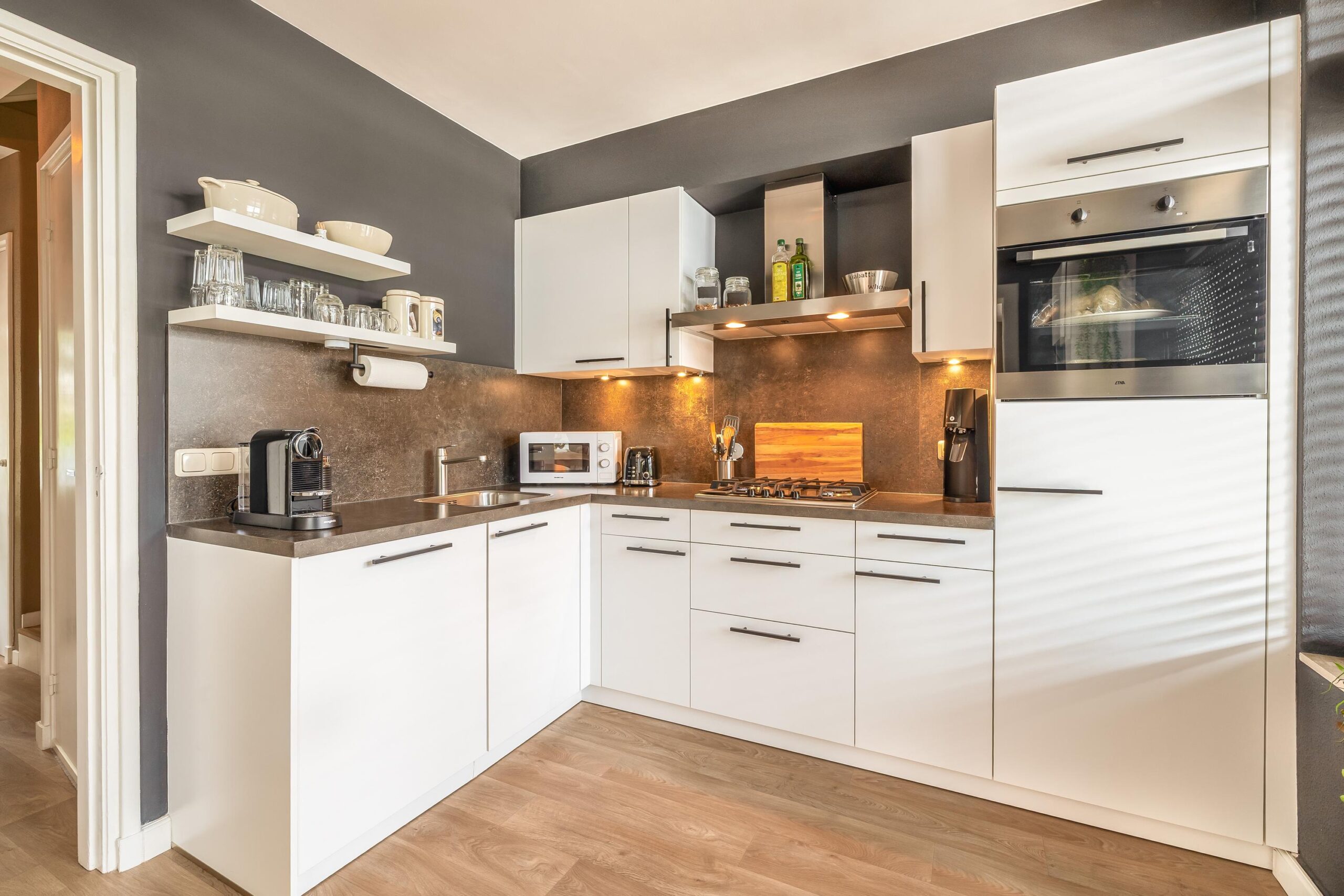 In de open keuken (ca. 8m²) zijn een vaatwasser, oven, koelkast en 4-pits gaskookplaat aanwezig. Een tweede loopdeur biedt ook vanuit hier toegang tot de serre.