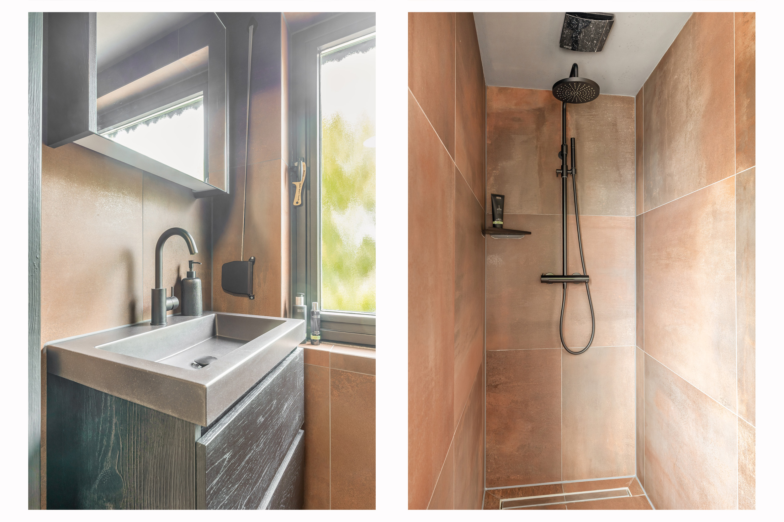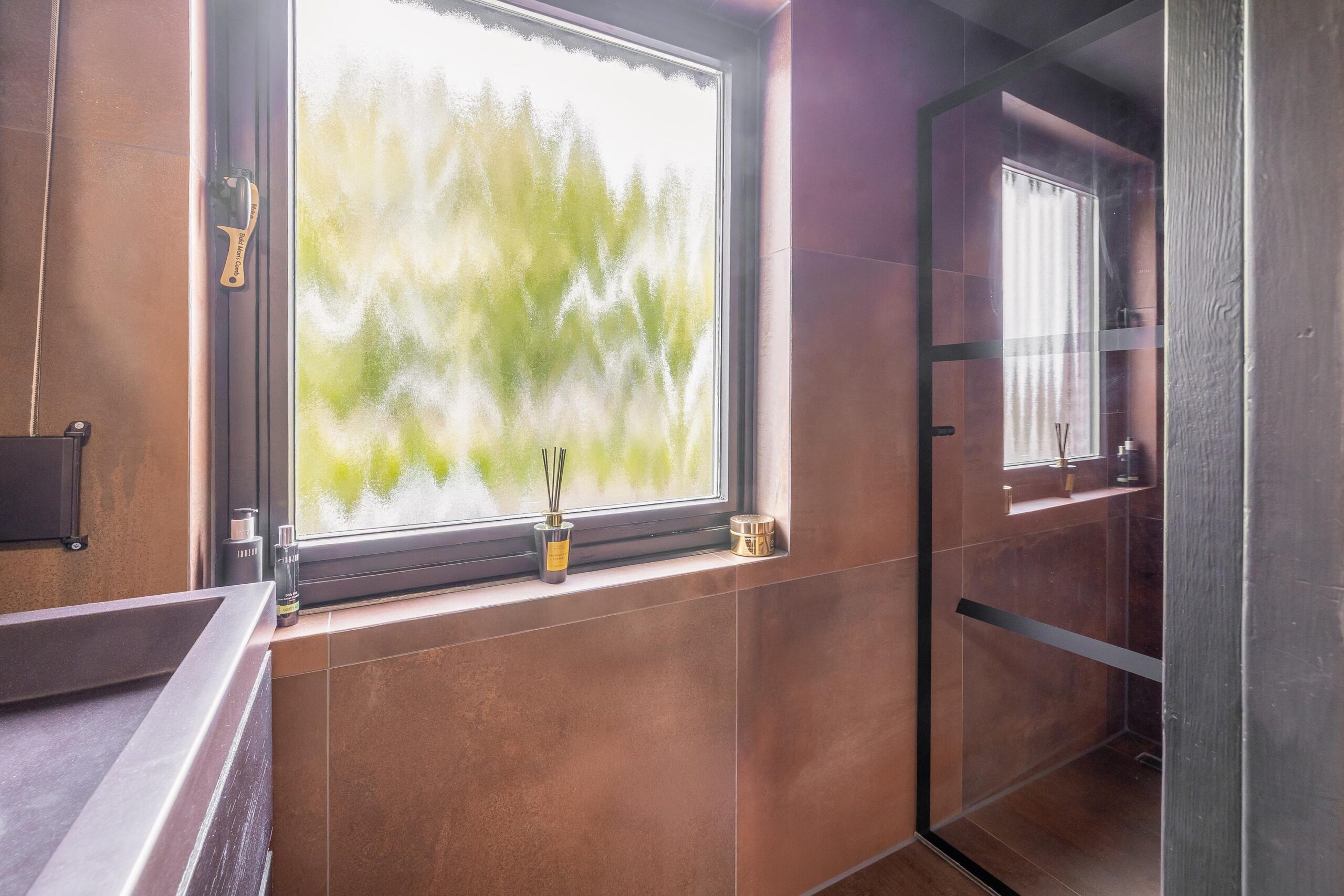In de moderne badkamer zijn een inloopdouche, wastafelmeubel, designradiator en mechanische ventilatie aanwezig. Het raam zorgt voor daglicht.