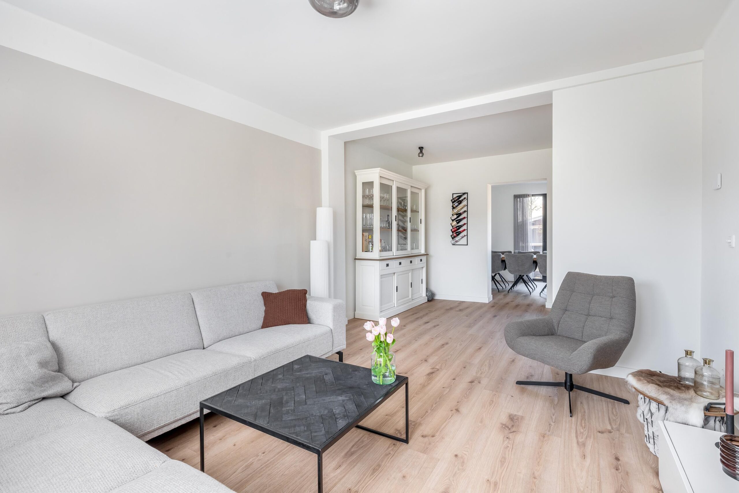 De woonkamer is licht, ruim en tegelijkertijd heerlijk knus. In 2023 is de woning uitgebreid met een moderne aanbouw, voorzien van vloerverwarming en sfeervolle inbouwspots.