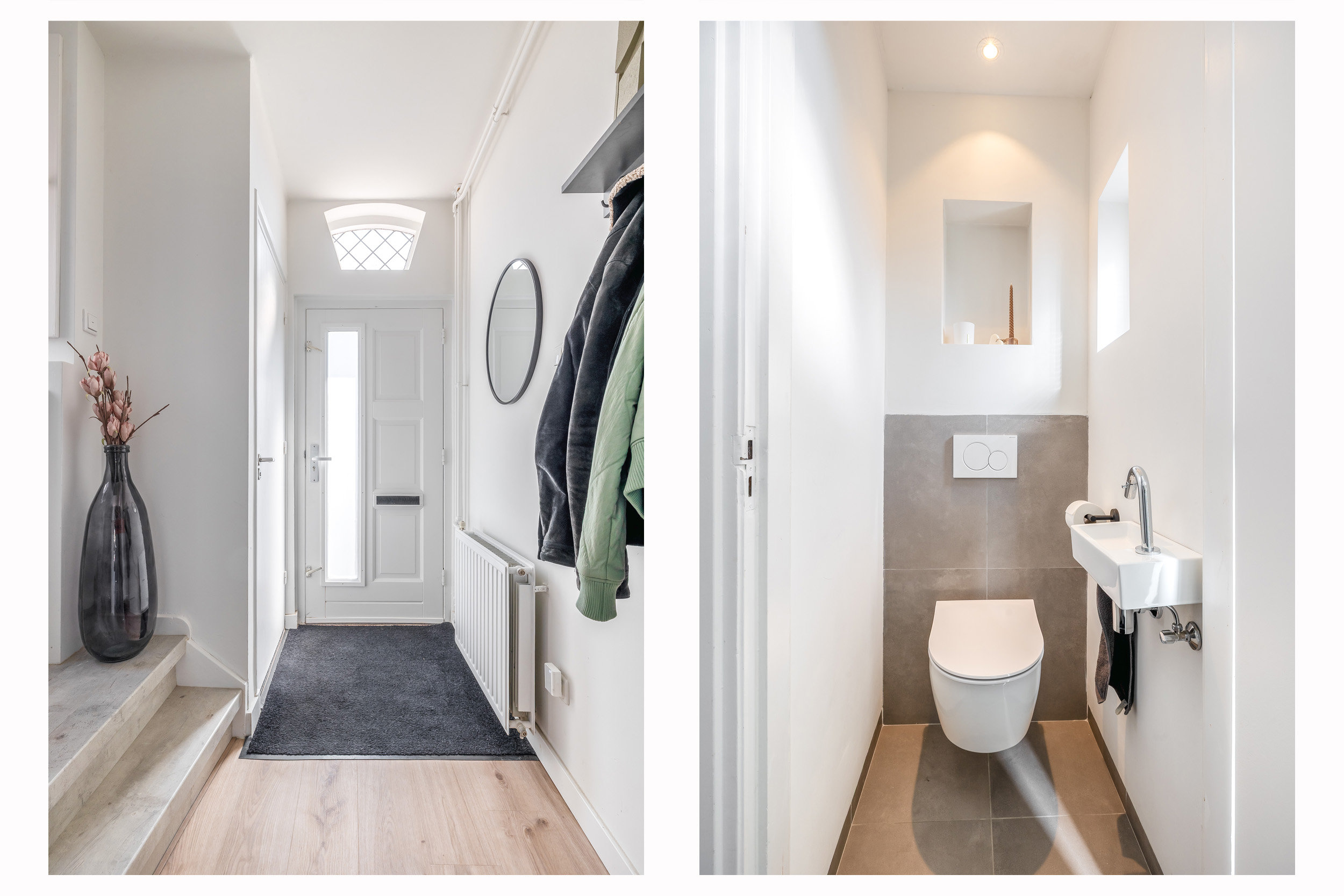 Bij binnenkomst valt direct de stijlvolle hal op, voorzien van een doorgelegde houtlook pvc-vloer welke zorgt voor een rustige en moderne uitstraling. Vanuit de hal heb je toegang tot het toilet met fonteintje, de kelder, een praktische muurkast, de trap naar de 1ste verdieping én de keuken.