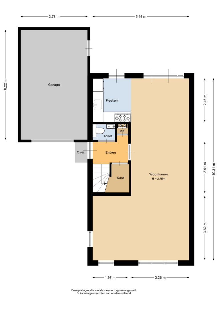 De grote garage heeft een openslaande deuren richting de oprit. Water en elektra is aanwezig. De garage kan eventueel gebruikt worden om bijvoorbeeld de keuken uit te bouwen tot leefkeuken.