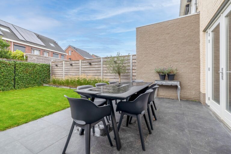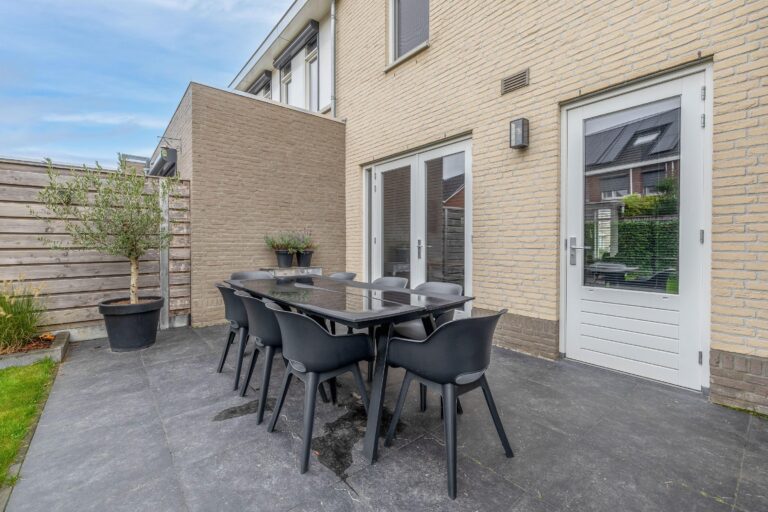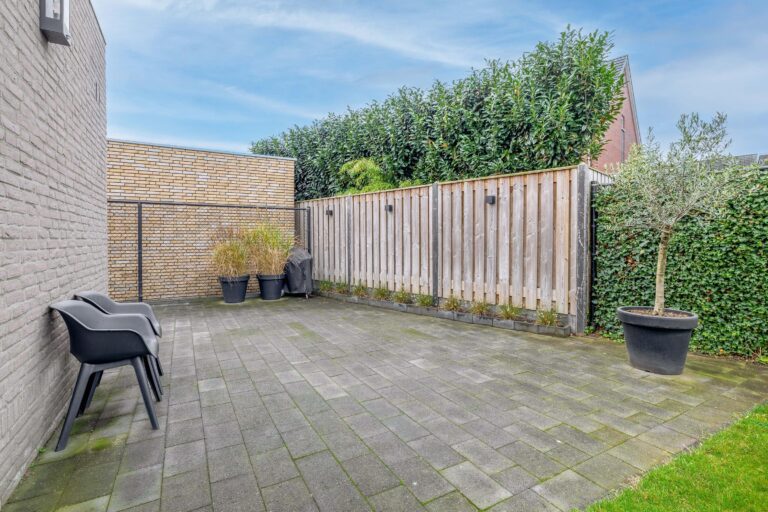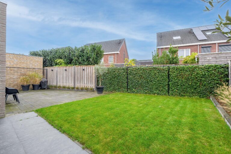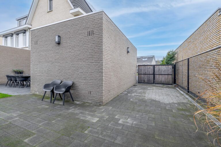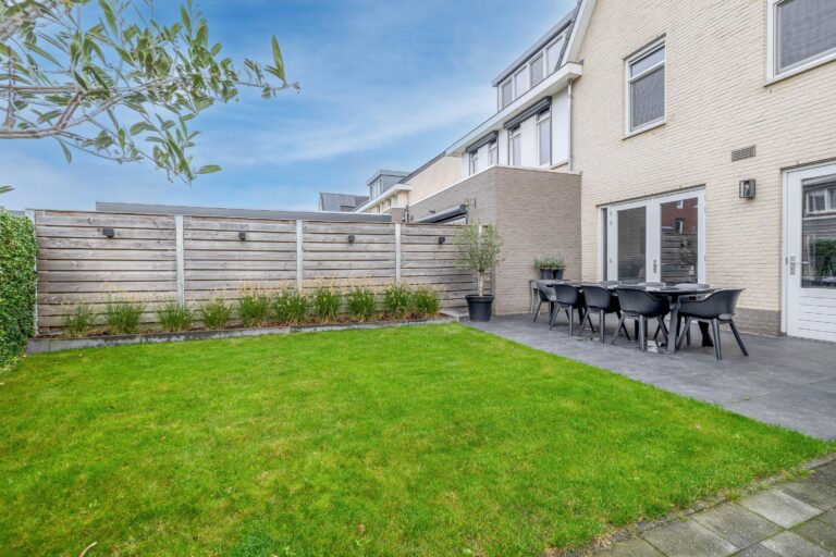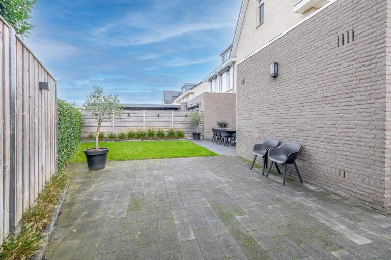 De achtertuin is volledig omheind en net aangelegd met een betegeld terras, gras en borders met beplanting. Je geniet hier heerlijk rustig. Aan de zijkant bevindt zich de vrije achterom. Dit is een grote openslaande tuinpoort.