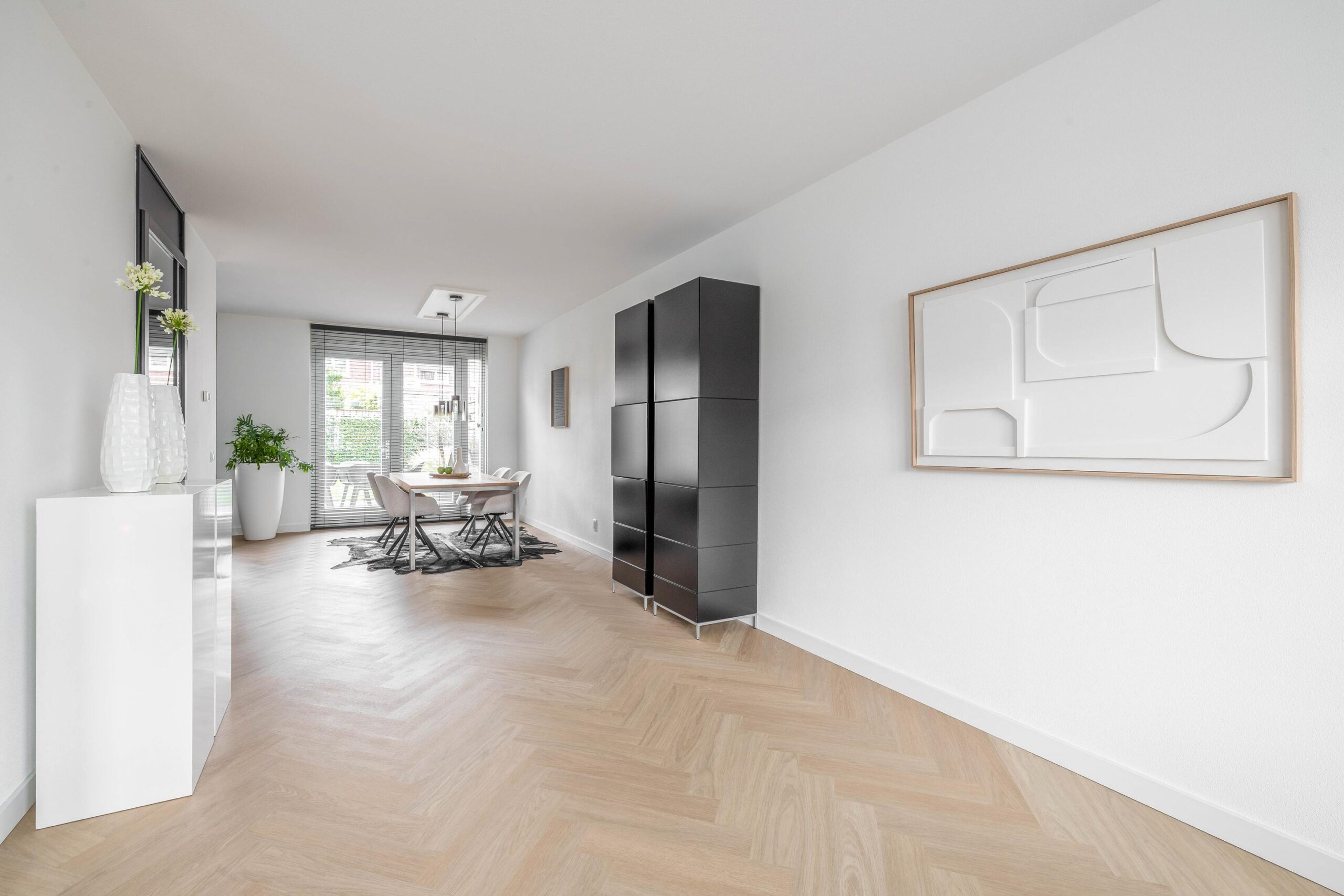 De L-vormige woonkamer met open keuken is voorzien van een mooie visgraat pvc-vloer met vloerverwarwming. De openslaande deuren en aparte loopdeur bieden direct toegang tot de achtertuin.