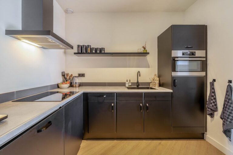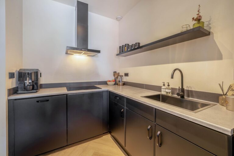 In de keuken (ca. 5,5m²) zijn een inductiekookplaat, afzuigkap, vaatwasser, combi oven/magnetron en koelkast aanwezig. De open keuken is in 2022 deels vernieuwd. Toen is ook alle apparatuur vervangen (m.u.v. de koelkast). Een loopdeur biedt toegang tot de grote overkapping in de tuin.