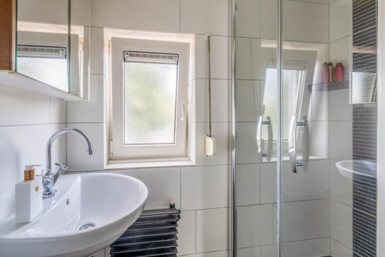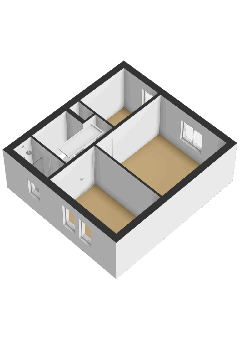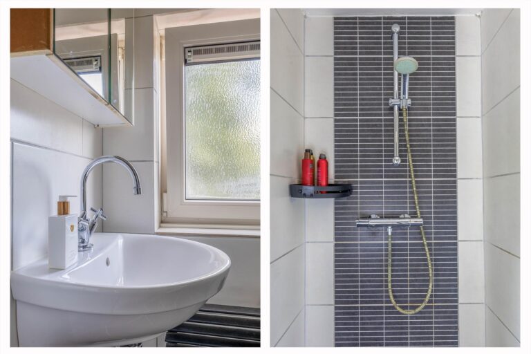 Alle slaapkamers (ca. 5m², 8,5m² en 13m²) zijn voorzien van rolluiken. Eén slaapkamer heeft een muurkast. In de badkamer (ca. 2m²) zijn een inloopdouche en wastafel aanwezig. Het raam zorgt voor voldoende daglicht en tevens natuurlijke ventilatie.