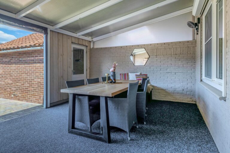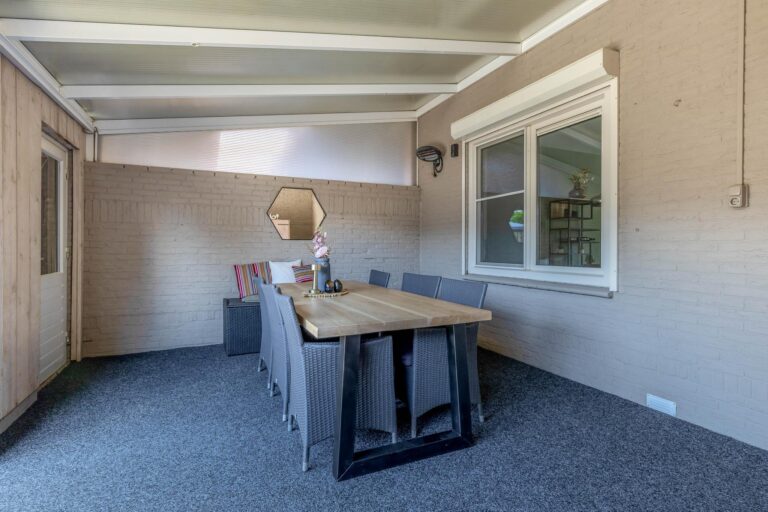 De royale overkapping (ca. 23m²) is voorzien van inbouwverlichting. Vanuit hier is de stenen berging (ca. 6m²) met elektra bereikbaar.
