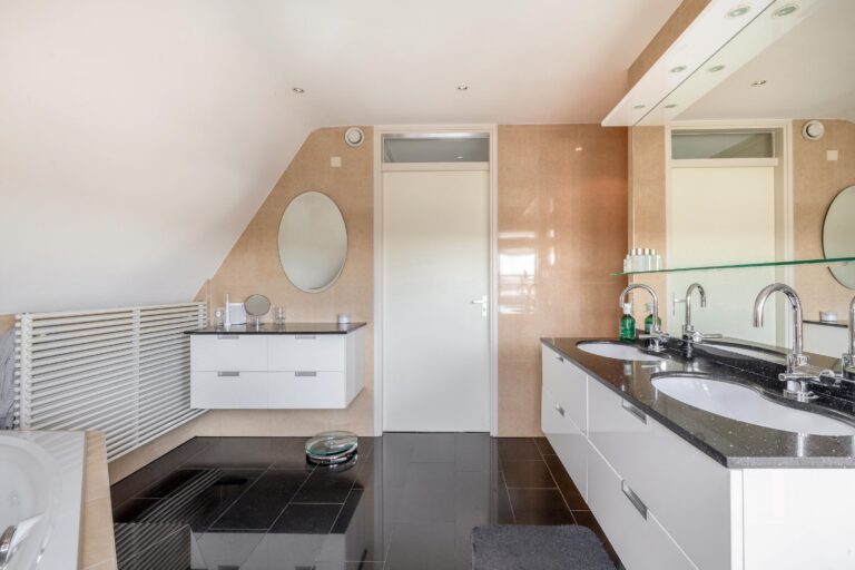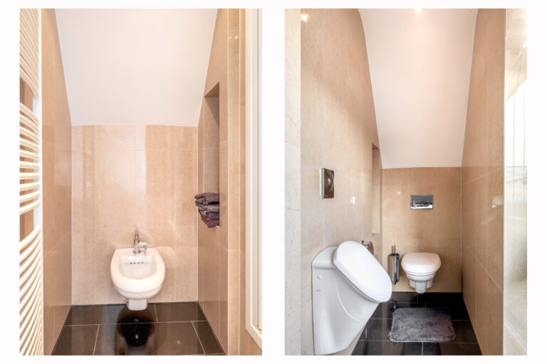 In de bijzonder ruime en luxe badkamer ligt dezelfde granieten tegelvloer met vloerverwarming. Er zijn een luxe whirlpool, een massage douche, een toilet, urinoir, bidet en een dubbel wastafelmeubel aanwezig.