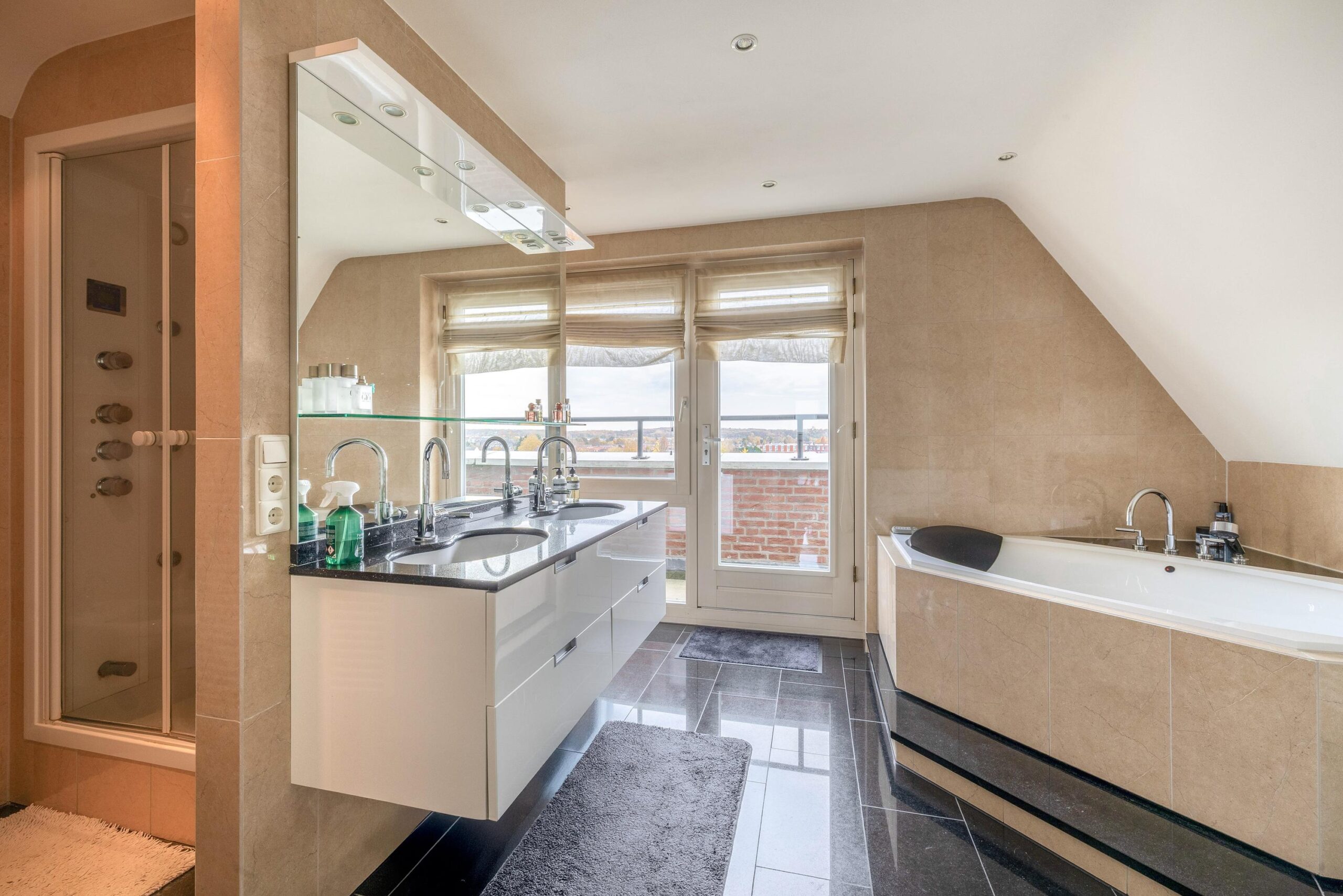 In de bijzonder ruime en luxe badkamer ligt dezelfde granieten tegelvloer met vloerverwarming. Er zijn een luxe whirlpool, een massage douche, een toilet, urinoir, bidet en een dubbel wastafelmeubel aanwezig.