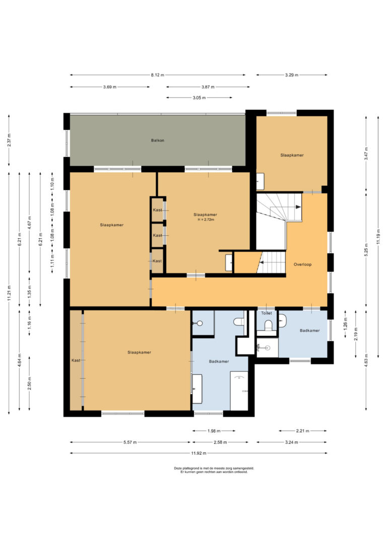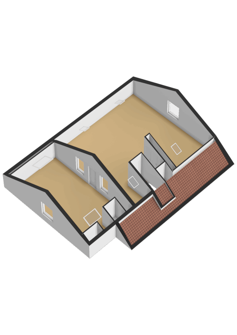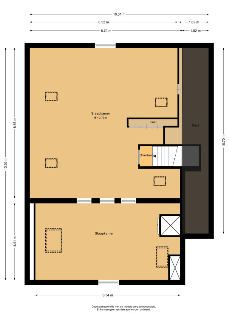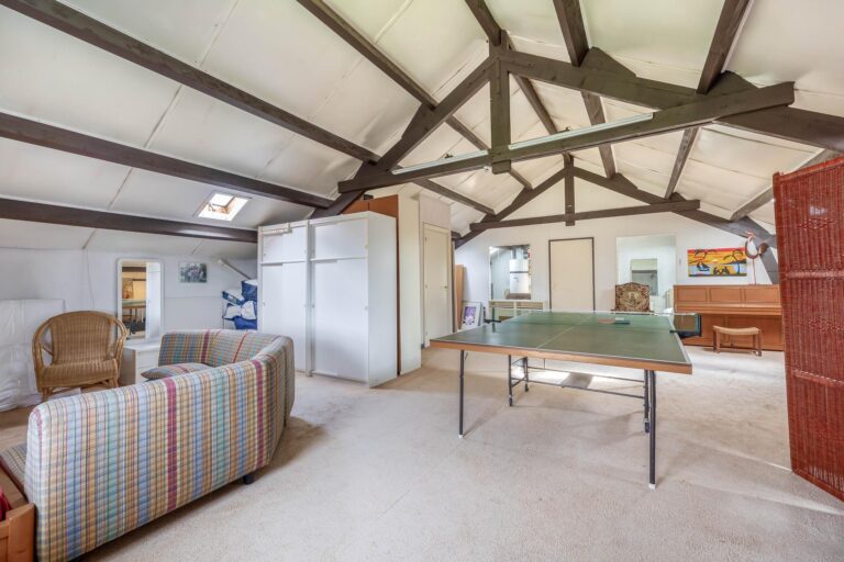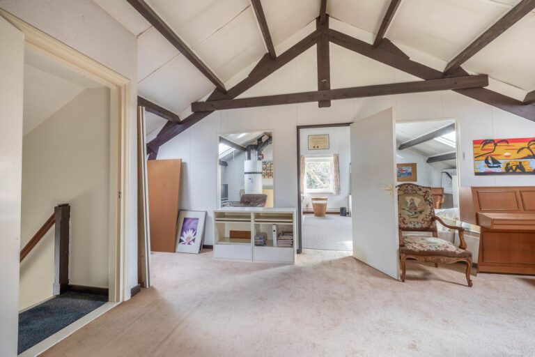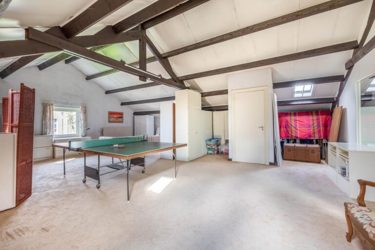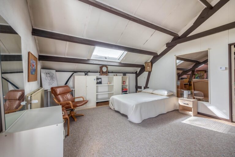 Een vaste trap biedt toegang tot de zeer grote tweede verdieping. Er is een grote ruimte (ca. 70m²) die diverse mogelijkheden biedt. Denk aan bijvoorbeeld extra slaapkamers, een werkkamer of bijvoorbeeld een hobbyruimte. Aan de voorzijde ligt een aparte kamer (ca. 37m²) met een open haard en twee Velux dakramen met Luxaflex.