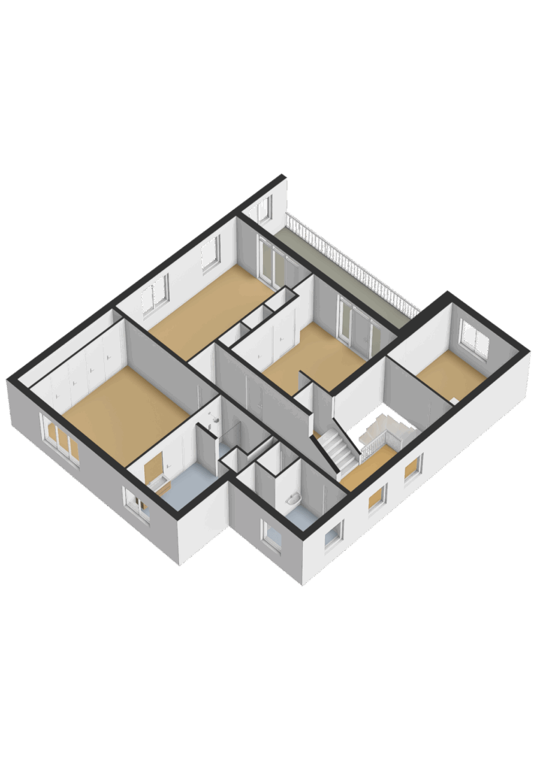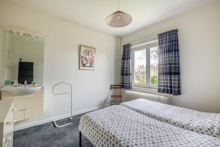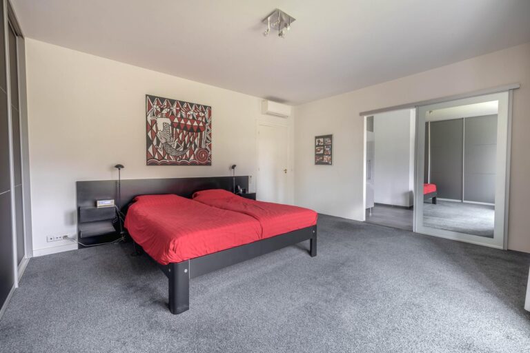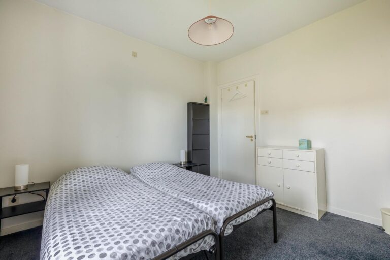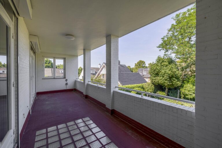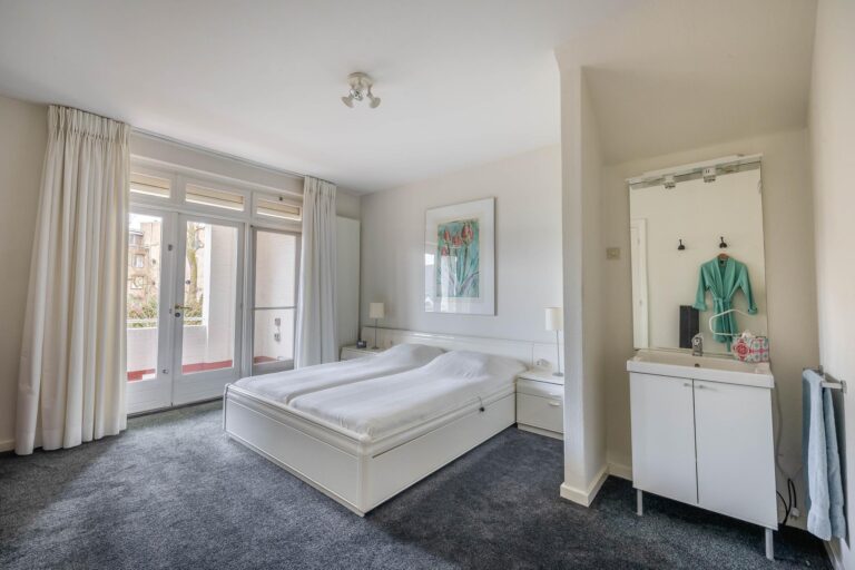 Slaapkamer 3 (ca. 17,5m²) is voorzien van vloerbedekking, een wastafel met meubel, 2 muurkasten en openslaande deuren naar de loggia. Vanuit de grote loggia (ca. 19m²) is er een mooie uitzicht op de eigen tuin.