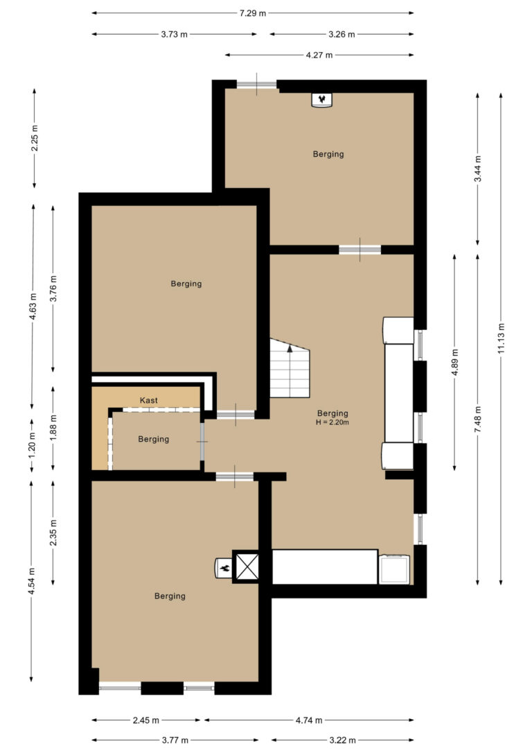 Het gehele souterrain heeft een uitstekende stahoogte en is zeer groot. Met meerdere ruimtes biedt het souterrain mogelijkheden. Zo is er onder andere een wijnkelder en een hobbyruimte. Ook bevinden zich hier de cv-ketel en de meterkast. Vanuit een van de ruimtes biedt een trap toegang tot de achtertuin.