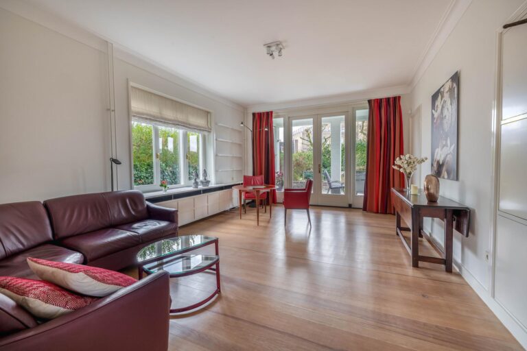 De royale L-vormige woonkamer (ca. 54m²) heeft dezelfde houten vloer. De open haard zorgt voor extra sfeer. Aan de zijkant is een aparte serre (ca. 9m²). Het uitzicht aan de voorzijde is fantastisch. Door het grote raam waan je je middenin het Wilhelminapark. Aan de achterzijde geven openslaande deuren toegang tot het terras en de tuin.
