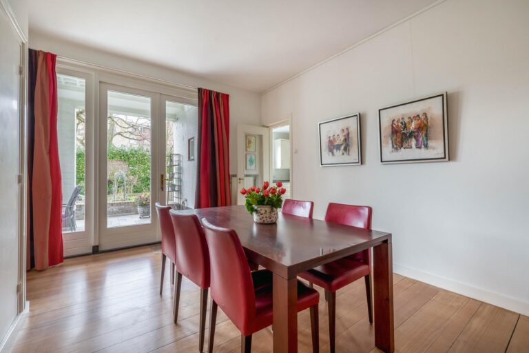 In de eetkamer (ca. 18m²) ligt een houten vloer en er zijn twee inbouwkasten. Openslaande deuren bieden toegang tot het terras en de achtertuin.