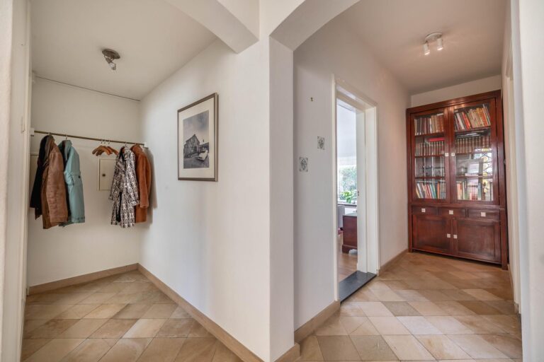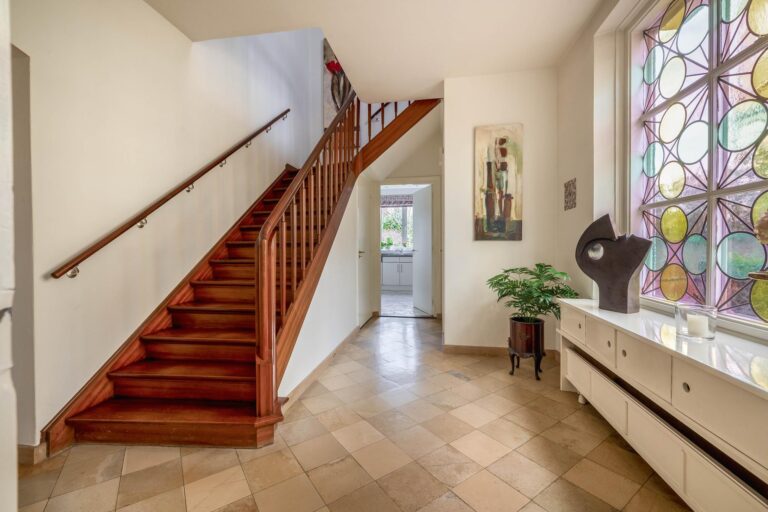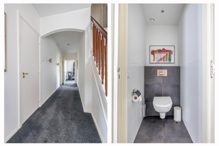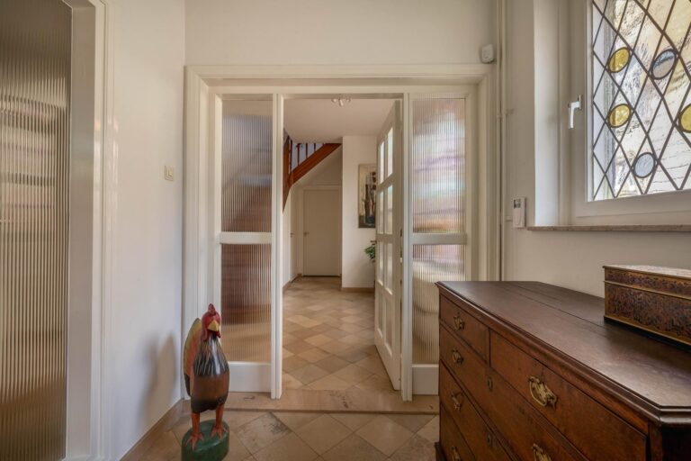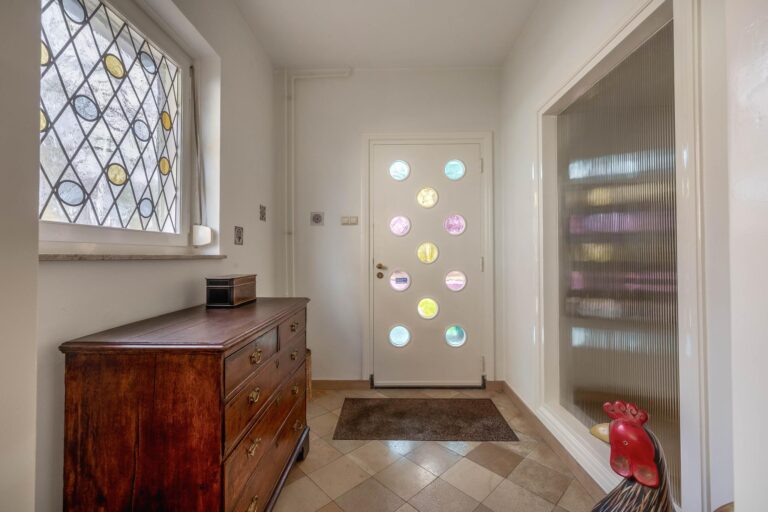 De kleine hal heeft een glas-in-lood raam en er ligt een tegelvloer. Vanuit hier is de grote hal bereikbaar. Hier ligt dezelfde tegelvloer. Deze hal heeft een groot design glas-in-lood raam en geeft toegang tot de garderobe, woonkamer, keuken, kelder en het toilet.