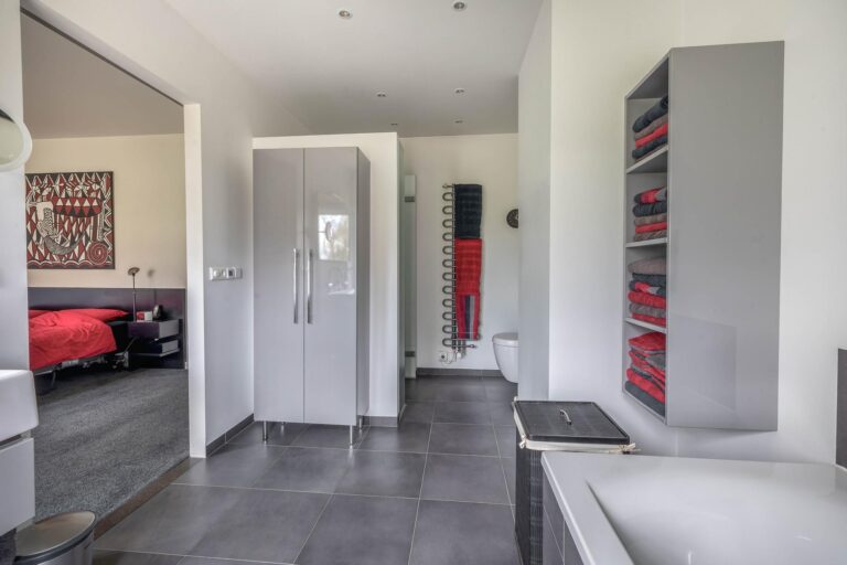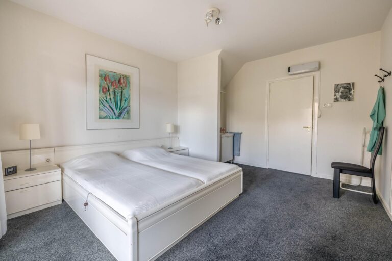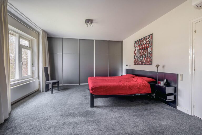 Slaapkamer 1 (ca. 26m²) is voorzien van vloerbedekking, een vaste kastenwand, airco en een en-suite badkamer (ca. 12m²) met ligbad, inloopdouche, toilet, dubbele wastafel met meubel en mechanische ventilatie.