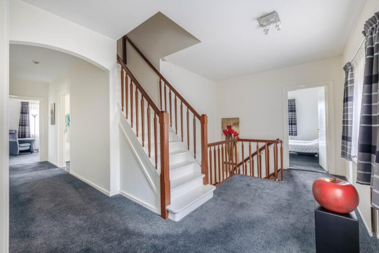 De fraaie beukenhouten trap leidt naar de overloop, die is voorzien van vloerbedekking en toegang biedt tot de vier slaapkamers, een van de twee badkamers en het aparte toilet.