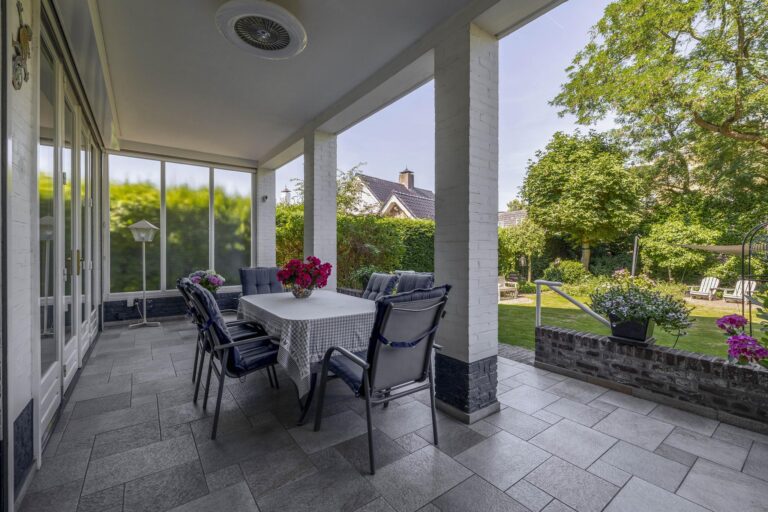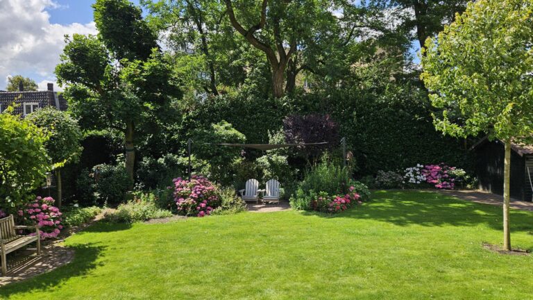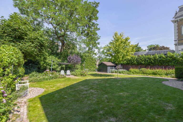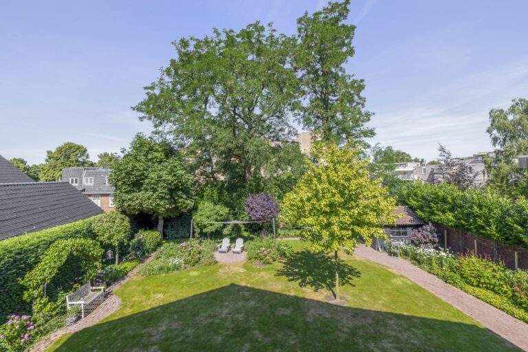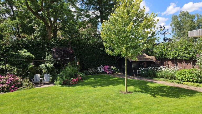 De achtertuin is prachtig aangelegd en voorzien van veel groen; gras, bomen en beplanting. De hele tuin is omheind en je hebt hier veel privacy. Op het royale terras (ca. 16,5m²) met overkapping is het heerlijk vertoeven. Er is een elektrische zonnescherm. Aan één zijde van het huis is een vrije achterom naar de achtertuin. De houten berging is ca. 10m².